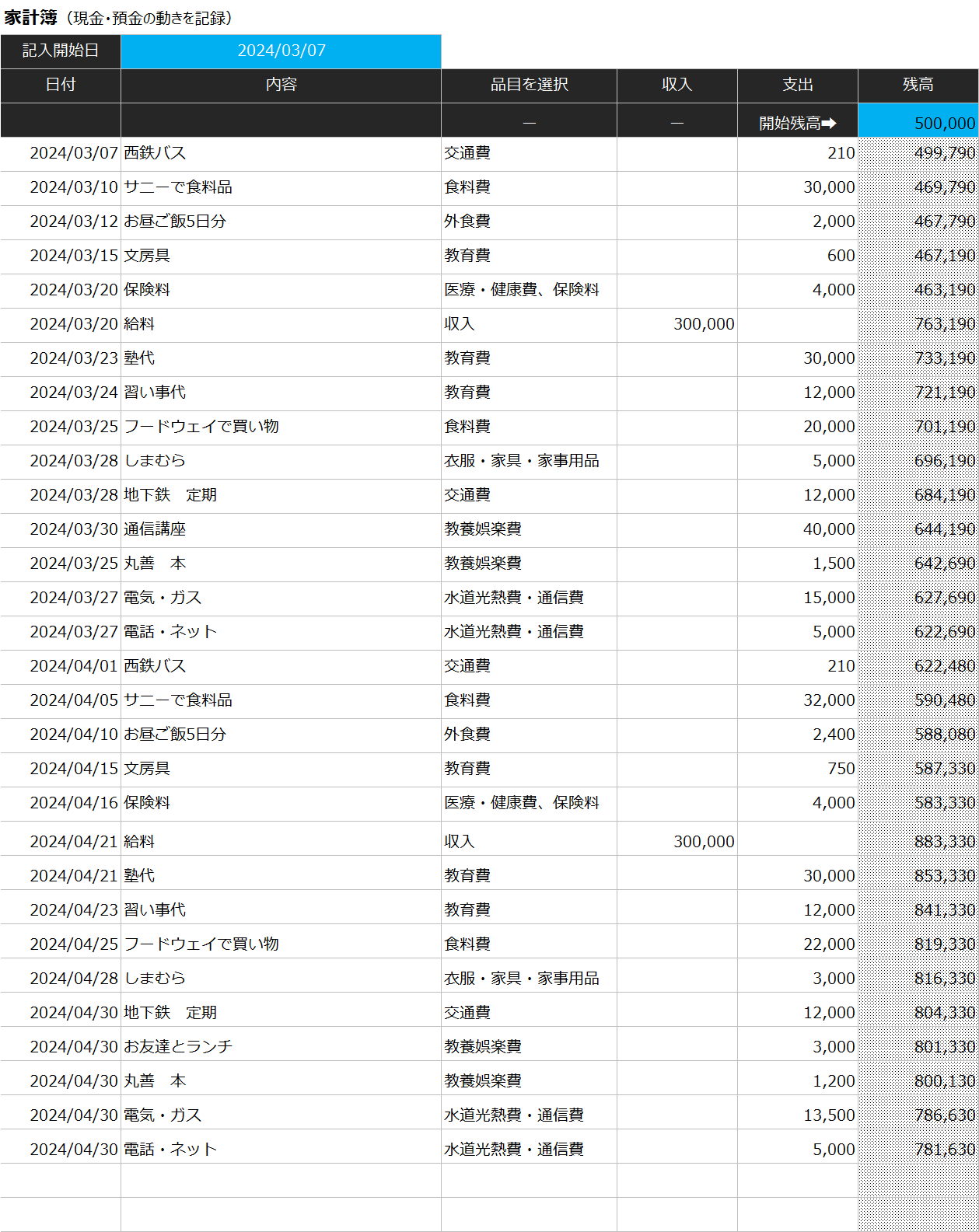 収入2科目、支出11科目の枠を用意しています。